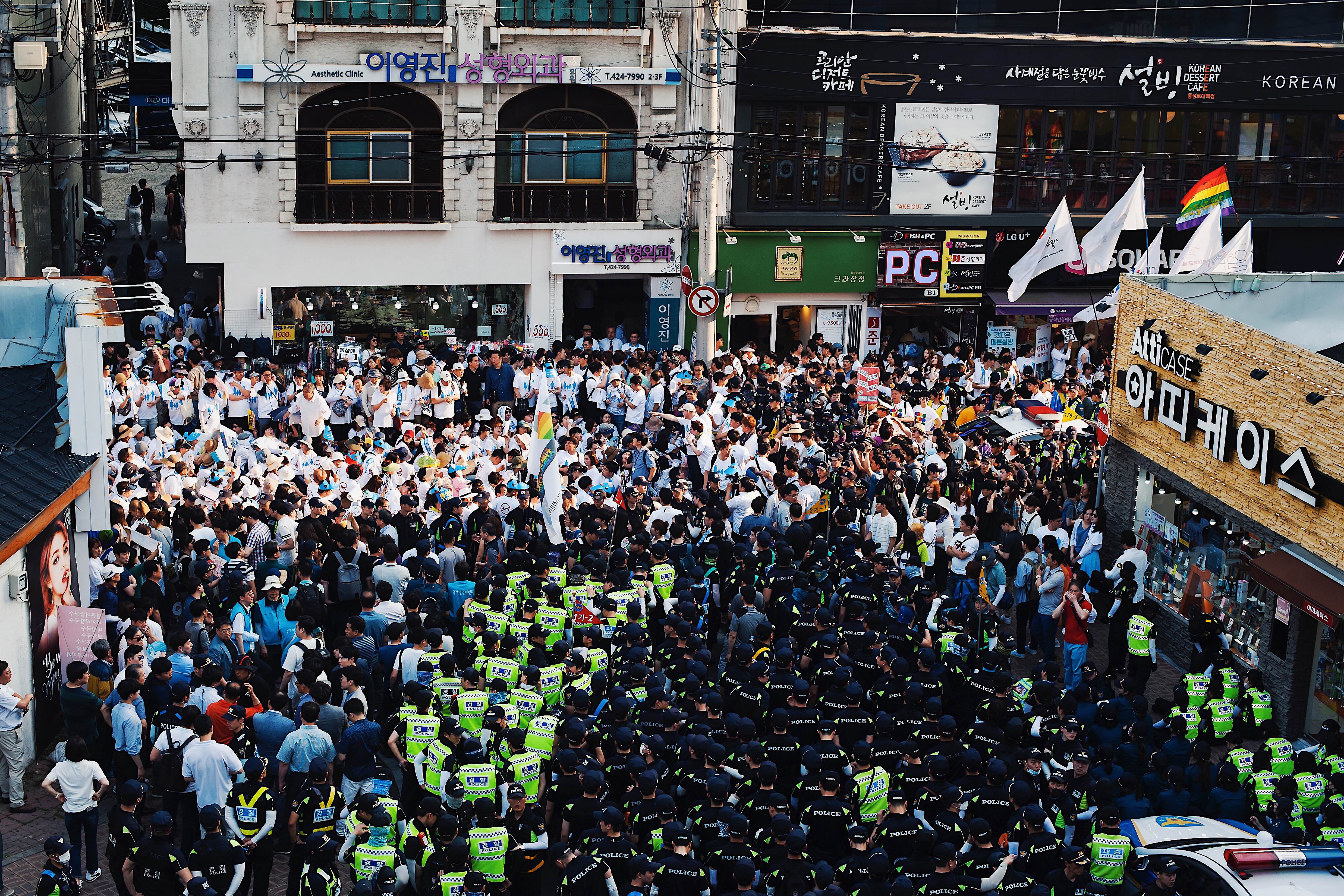 Anti-LGBTQ demonstrators at Daegu Queer Culture Festival in Daegu, Korea, June 2018. Despite police efforts to maintain control of protests against the parade, when over 500 religious demonstrators sat on the street, singing the national anthem and refusing to move, the parade had to be shut down. From ongoing project.