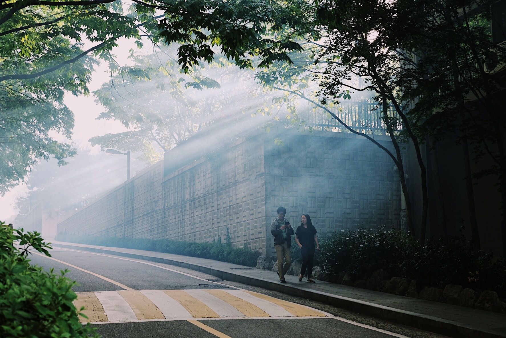 An apartment complex in Seoul amid building-wide bug repellent, May 2018.